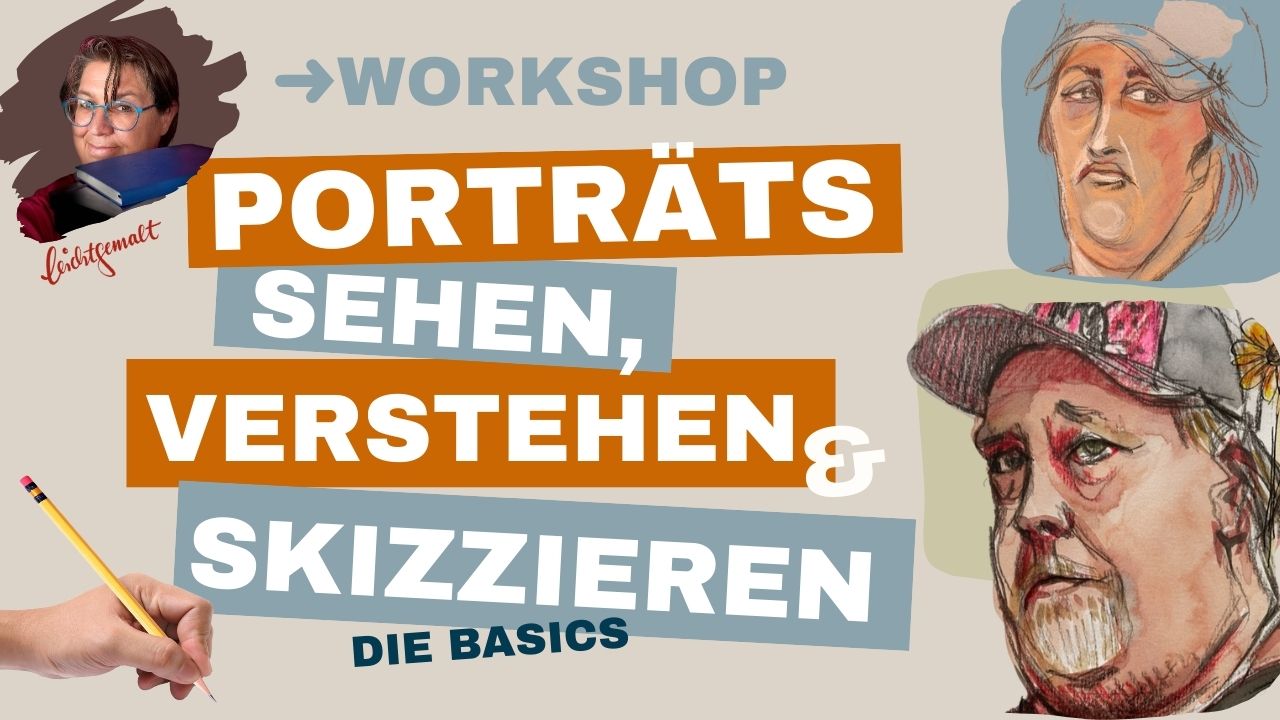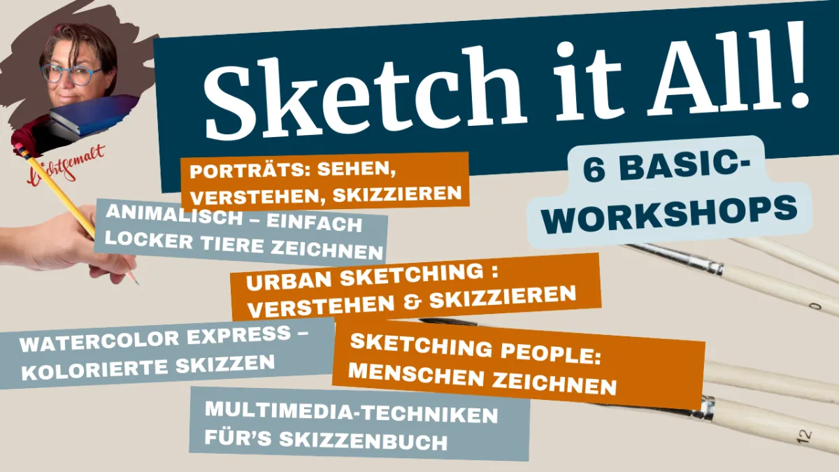 6 Workshops zu den Themen Porträts, Tiere, Urban Sketching, Watercolor, Menschen und Mixed Media in einer monatlichen Abfolge